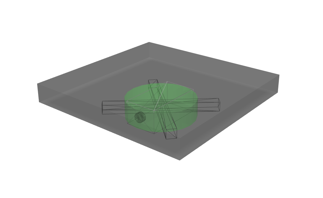 This sets this link's origin at a position 4[cm] forward, -4.5[cm] right, and 1.5[cm] upward from the CHASSIS link origin. This position is based on the parent link's coordinate system. To confirm the effect of relative position, let's try removing the translation description. Delete the translation line above or comment it out by adding # at the beginning of the line, then reload the model. You should find that the rotor part that was visible earlier has disappeared. This is because the rotor part is also placed at the center of the chassis and is buried inside it. So, turn ON Wire Frame Display in the scene view. You should see something like this: