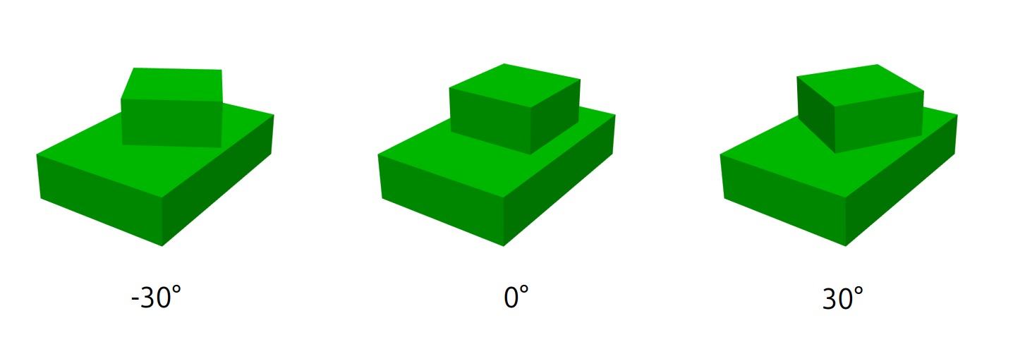 This display shows that a joint with joint ID 0 has been defined. Try operating the slider here. You should be able to confirm that the box corresponding to the joint rotates around the yaw axis in the scene view. For example, the model poses when the joint angle is -30°, 0°, and +30° are as follows: