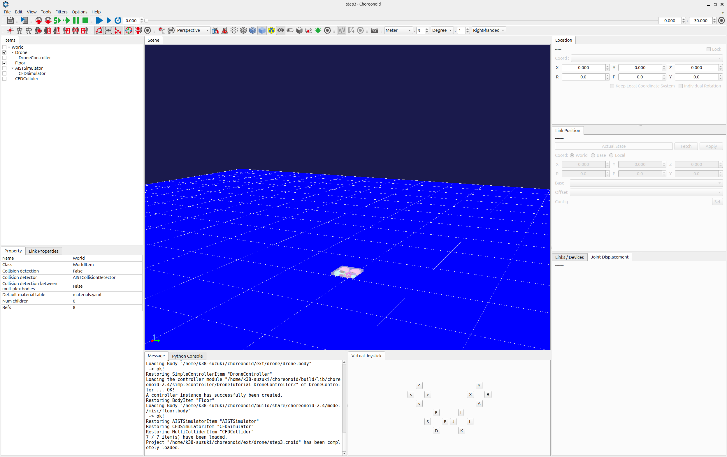 Now, let’s try using this controller as a controller for the Drone model. You should still have the project you created in Step 2. All you have to do is change the controller settings. Carry out the Setting the controller body described in Step 2 and ensure that you overwrite the DroneTutorial_DroneController2.so file we created previously. This completes the controller setup. Now, save this project as step3.cnoid.
