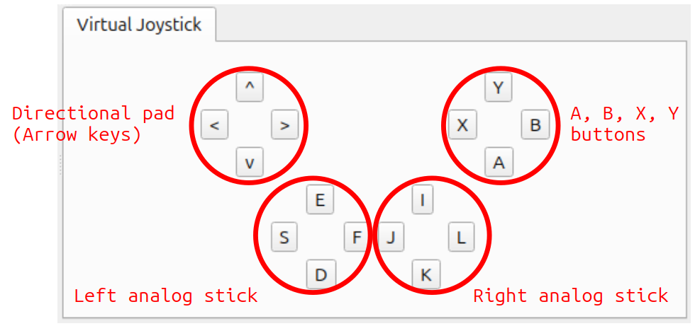 The gamepad should now be working to control the Drone model. Try moving it around. If you are using an F310, the right analog stick should let you move the Drone model. Try moving its axis. For other gamepads, you can experiment to see which axes correspond, etc. If things do not function as intended, try changing the axis settings in your source code. This will be explained in the next section. If using the Virtual Joystick View, you can manipulate the view using the keyboard. The buttons onscreen correspond to the directional pad and analog stick axes of a gamepad, as well as the buttons. The correspondence is explained in the image below.